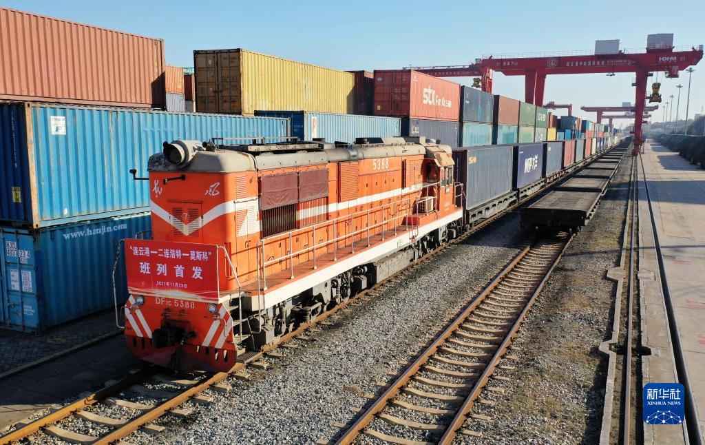 图二 11月23日,“连云港—二连浩特—莫斯科”中欧班列在江苏连云港中哈物流基地整装待发。新华社发(王健民 摄)