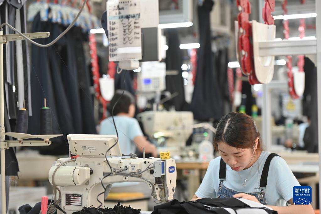 图三 在位于福建省泉州市经济技术开发区的九牧王西裤智能化生产车间,工人在自动化西裤吊挂流水线上作业(7月30日摄)。新华社记者 宋为伟 摄