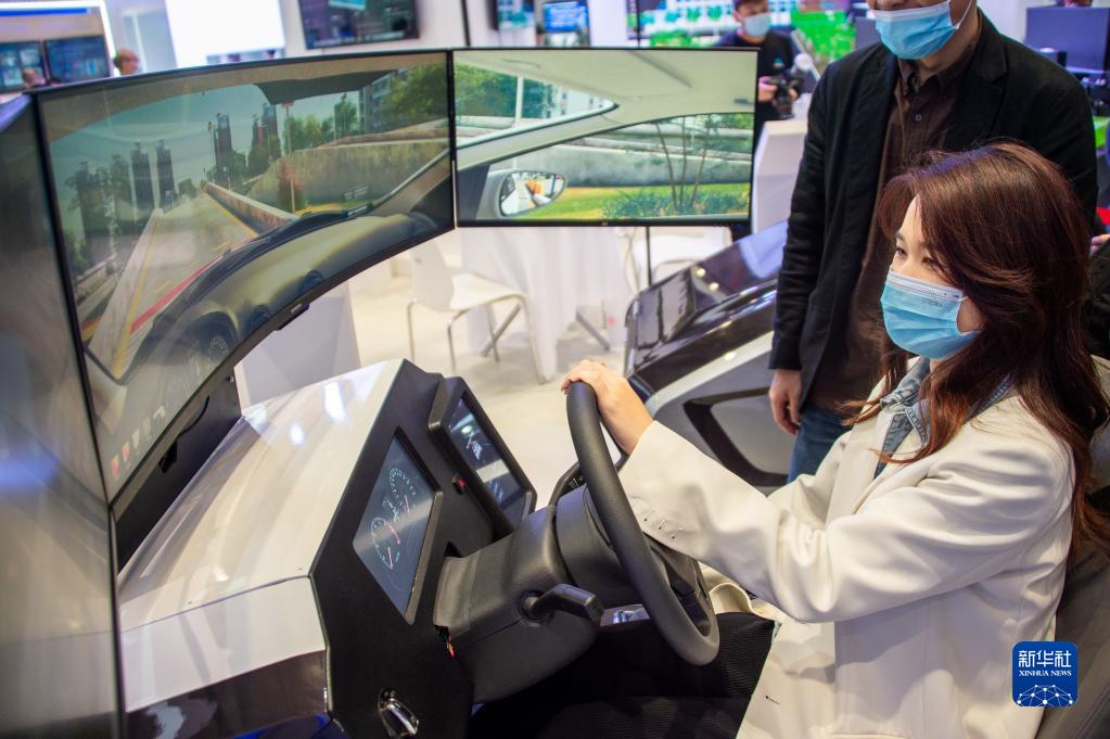 图六 11月19日至21日,2021中国5G+工业互联网大会在位于武汉的中国光谷科技会展中心举行。这是 11月19日,参观者在“5G+工业互联网成果展”上体验驾驶智能模拟器。新华社发(伍志尊 摄)