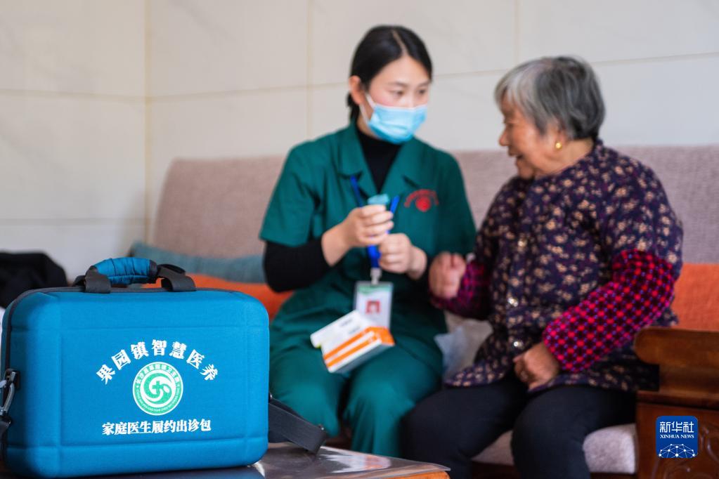 图七 11月12日,在湖南省长沙市长沙县果园镇杨泗庙社区,医务人员刘敏指导居家老人用药。新华社记者 陈思汗 摄
