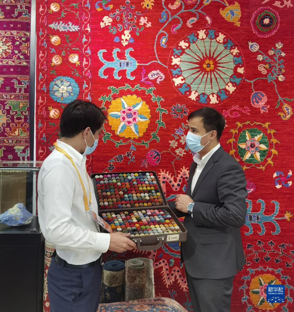 图八 11月5日,阿富汗参展商阿里·法伊兹(右)在第四届进博会阿富汗手工羊毛地毯展台忙碌。新华社记者 吴宇 摄