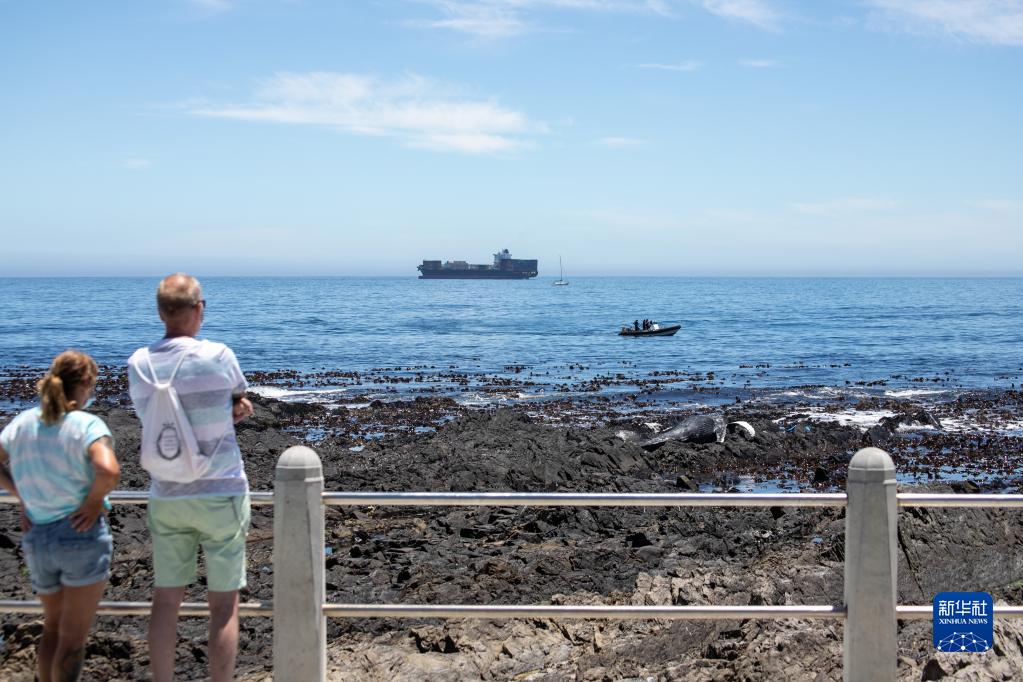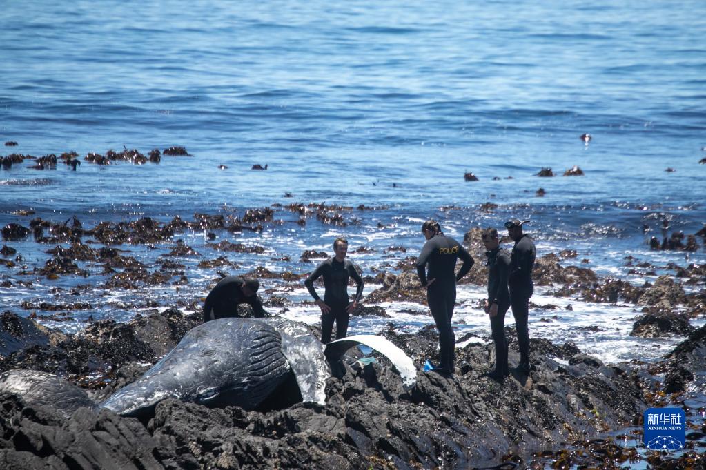 12月9日,在南非开普敦,警察站在海岸边的座头鲸尸体附近。