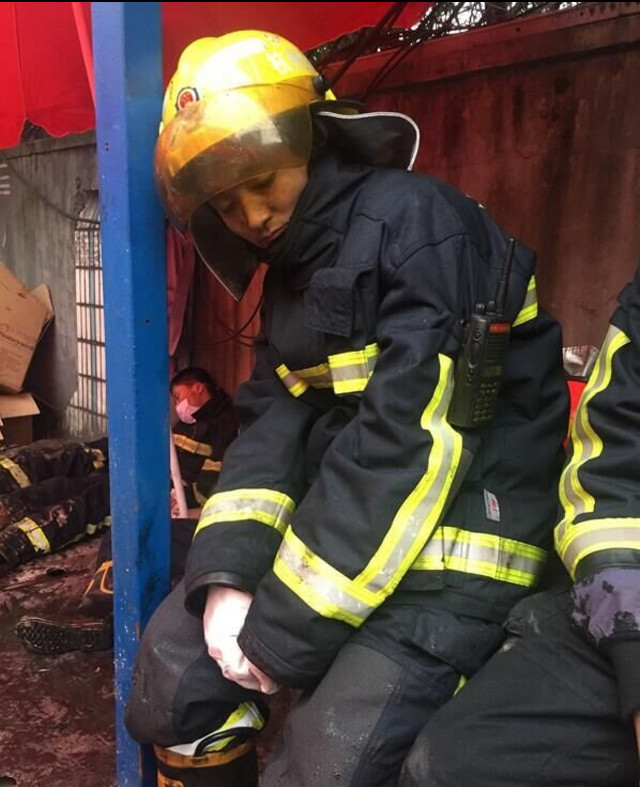12日傍晚,杭州一橡胶仓库发生火灾,杭州消防指挥中心先后调派30辆消防车投入救援。明火被控制后,很多消防员通宵作战,清理余火。凌晨三四点,已经累到极点的他们,三三两两蜷缩着席地而睡,脸上满是黑渍。