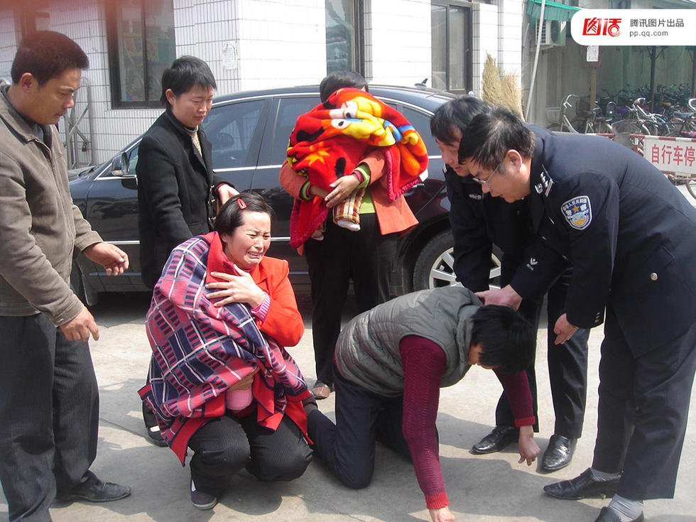 2007年,犯罪嫌疑人赵广章、赵广强两人冒充计生办工作人员,谎称能给0-6个月婴儿免费查体,将山东省邹城市大束镇张东村两名男婴及其家长,骗到邹城市人民医院,寻找借口将婴儿同其父母分开,欲将婴儿卖给等在楼下的另外一名犯罪嫌疑人。图为婴儿被解救后,父母带其向公安民警表示感谢。