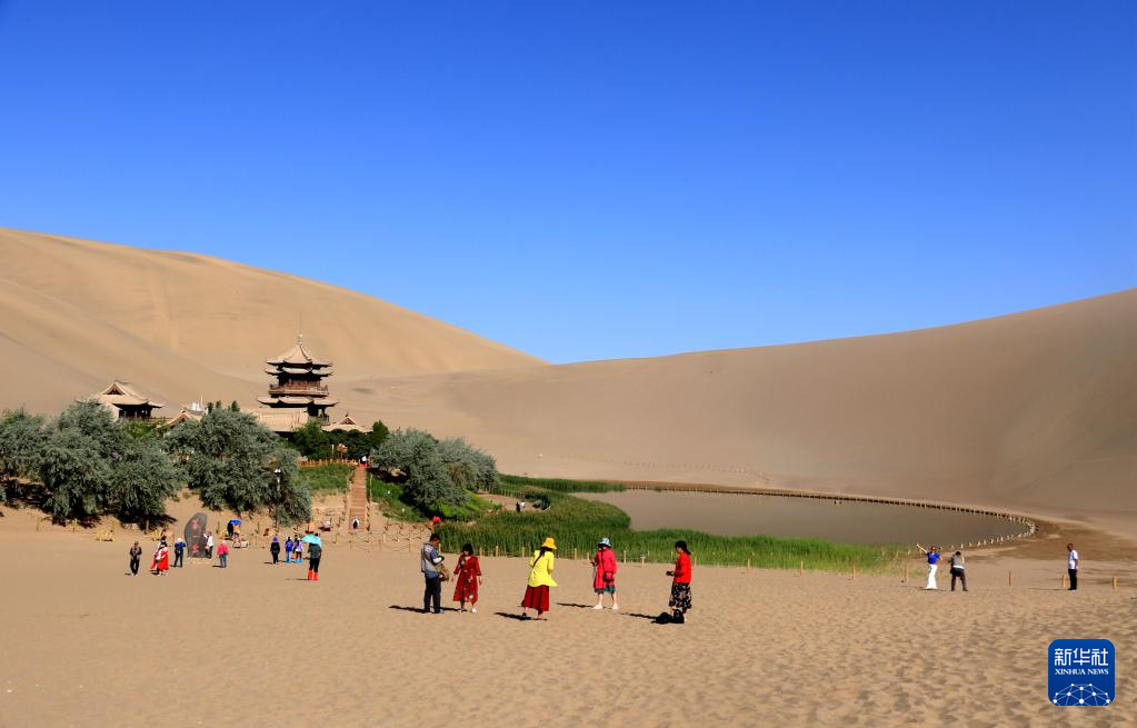6月19日,游客在甘肃省敦煌市鸣沙山月牙泉景区骑骆驼游览。
