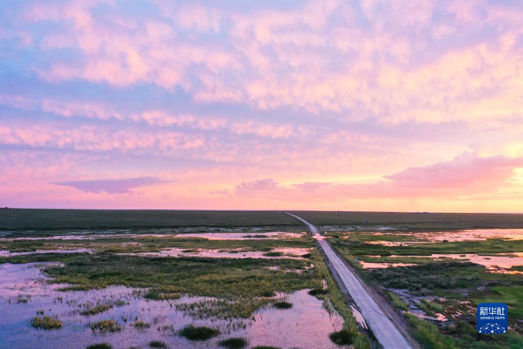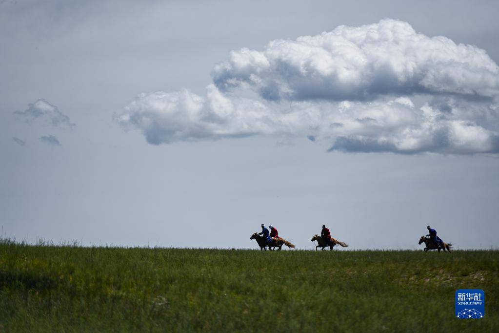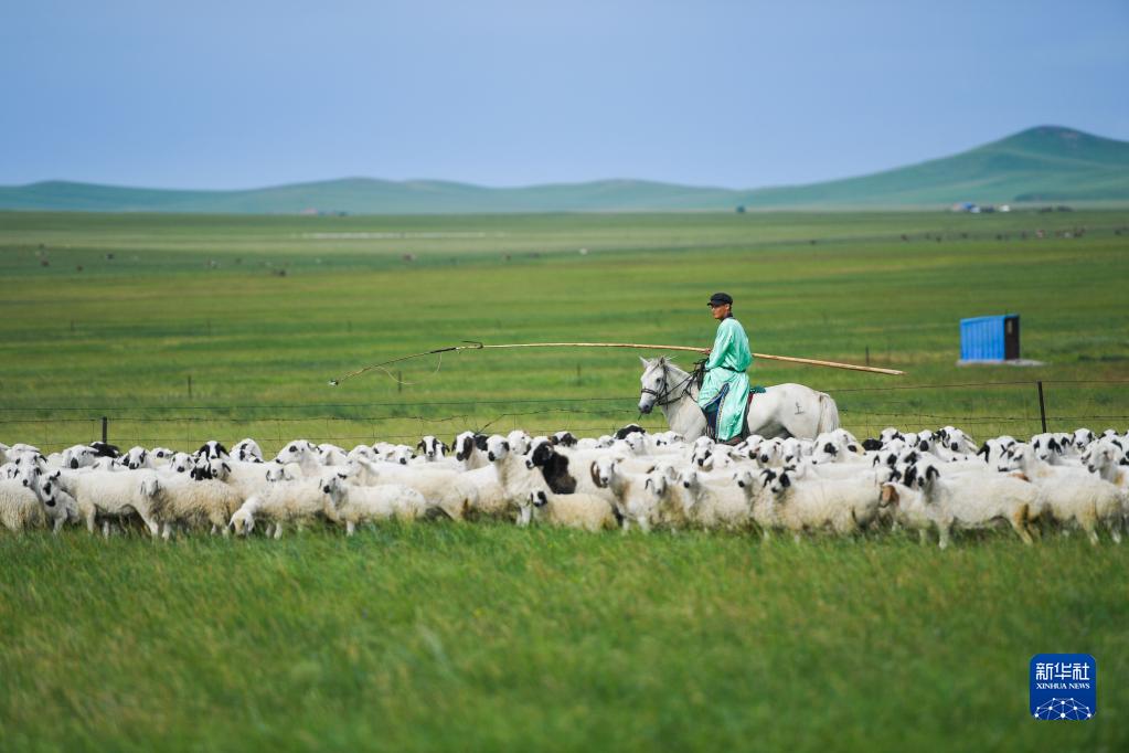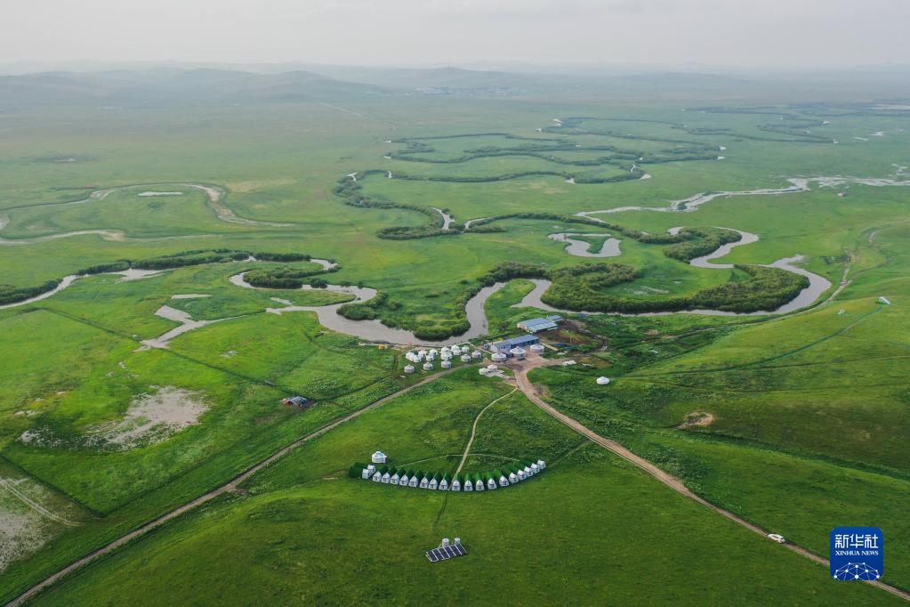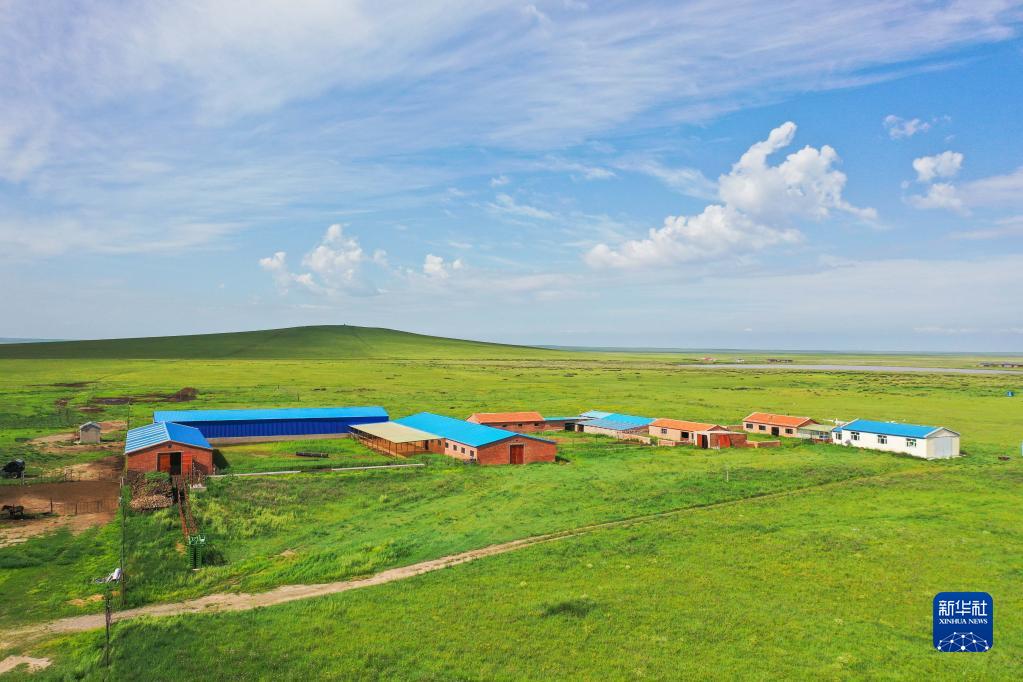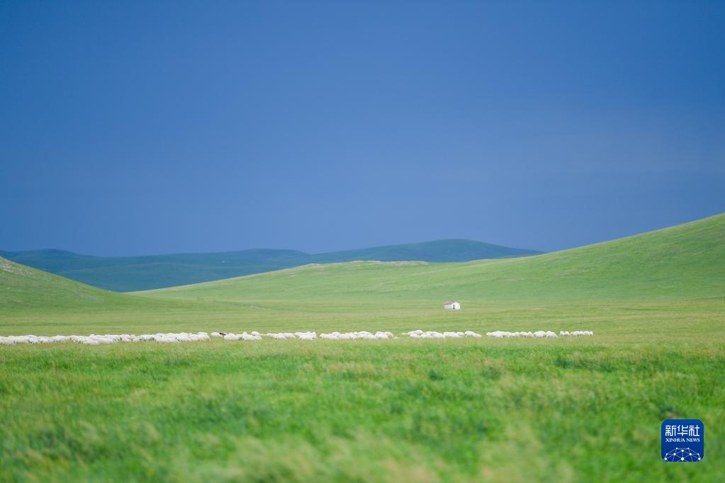 夏日,内蒙古锡林郭勒草原一碧千里,牛羊散落其中,河流蜿蜒曲折,景色宜人。