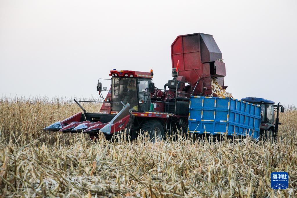 10月29日,在内蒙古通辽市科尔沁左翼中旗花吐古拉镇三家子村的盐碱化耕地改良试点示范区,农机手驾驶收割机收割玉米。