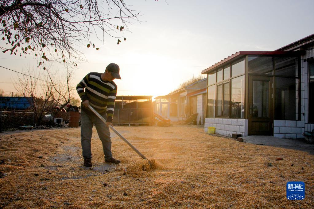 10月29日,在内蒙古通辽市科尔沁左翼中旗花吐古拉镇三家子村,一位村民晾晒玉米。