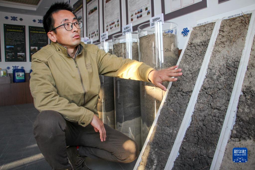 10月29日,在内蒙古通辽市科尔沁左翼中旗花吐古拉镇三家子村的盐碱地改良项目示范基地内,工作人员王伟介绍盐碱地分类。