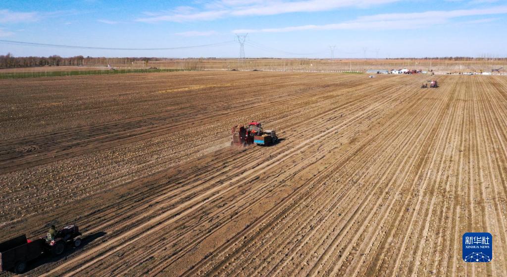 在内蒙古通辽市科尔沁左翼中旗花吐古拉镇三家子村,农机手驾驶播种机在盐碱化耕地改良试点示范区种玉米(2022年5月摄,无人机照片)。