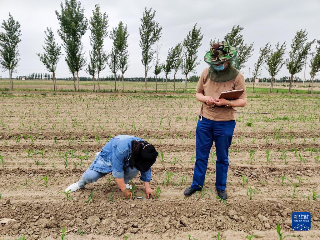 在内蒙古通辽市科尔沁左翼中旗花吐古拉镇三家子村,农技推广人员测量玉米株距(2022年6月摄)。