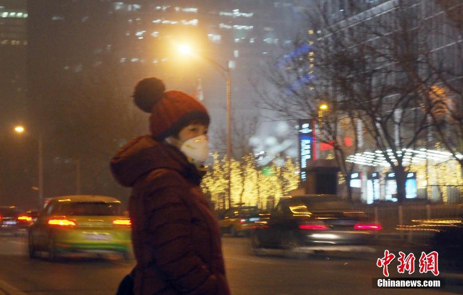 12月18日傍晚,北京持续雾霾天气,路人戴口罩出行。