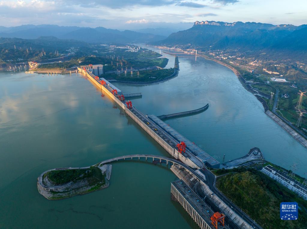 这是7月9日在湖北省宜昌市拍摄的夕阳映照下的三峡水利枢纽工程(无人机照片)。