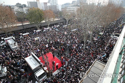 50多个团体组成“总统弹劾案国民总动员运动本部”,在宪法法院附近举行集会,要求驳回总统弹劾审判。