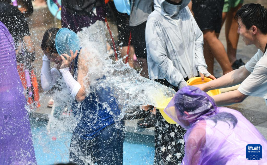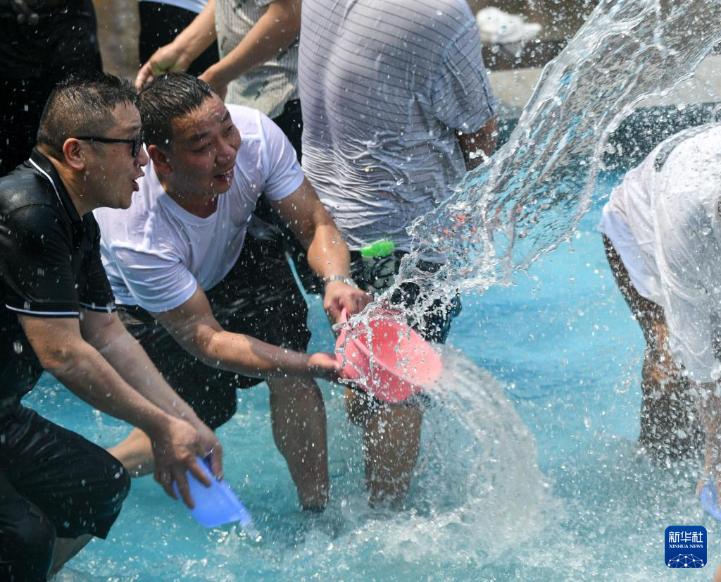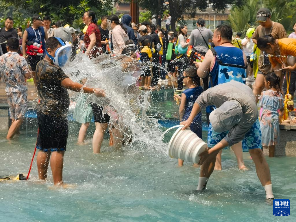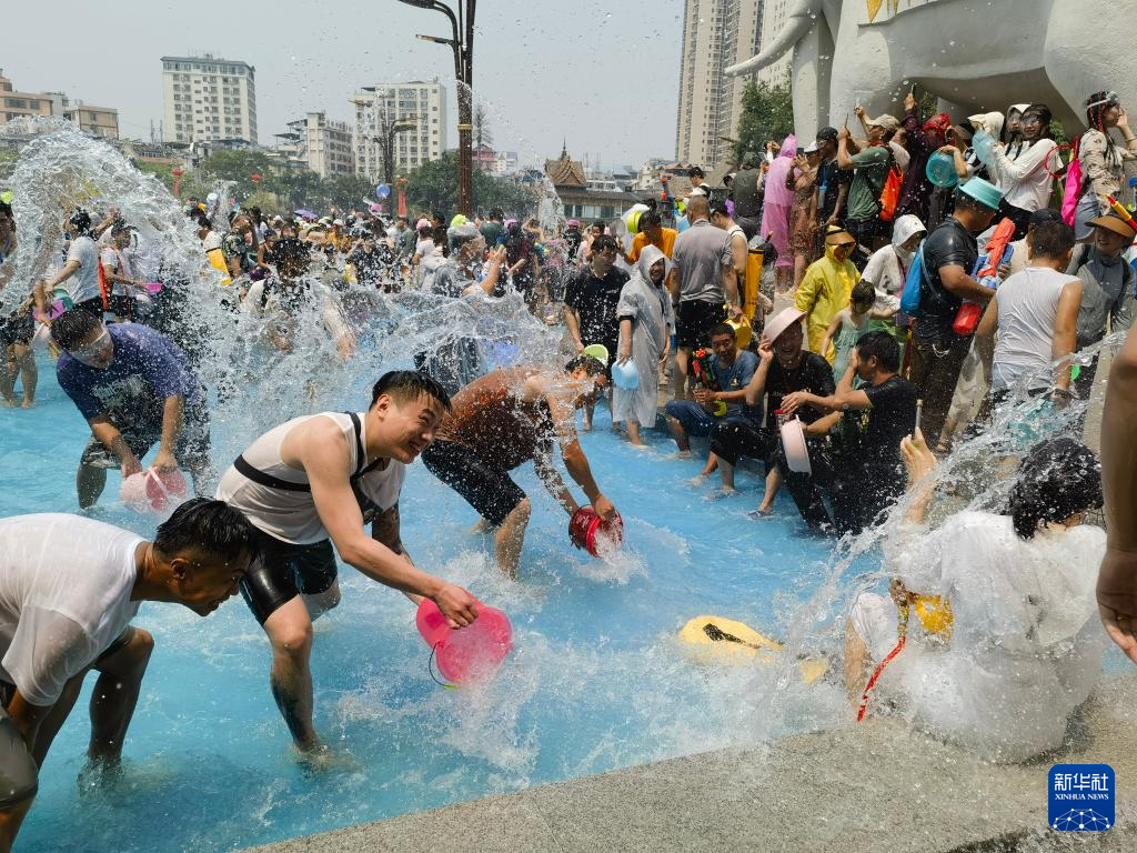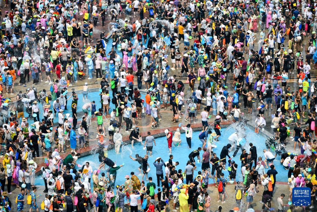 ??4月15日,云南省西双版纳傣族自治州举行泼水狂欢活动,人们欢聚在景洪市泼水广场,用相互泼水的方式互送祝福,庆祝泼水节。