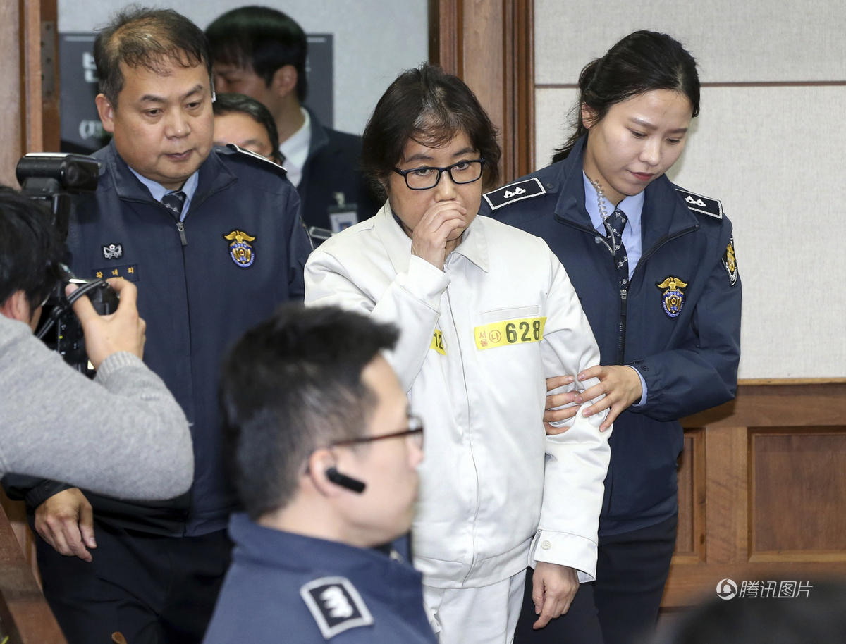 崔顺实进入法庭时,没有像之前那样口罩遮面,而是身穿号衣,露出真容,额前头发已经花白。