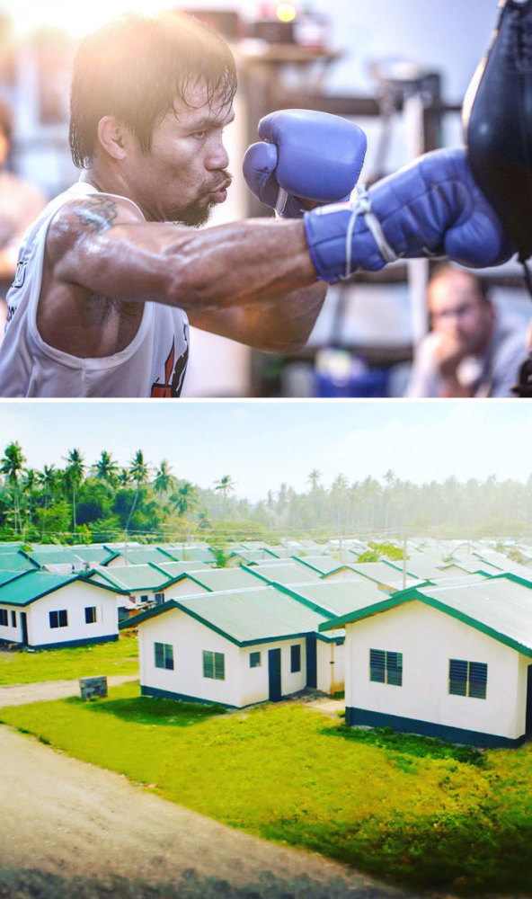 菲律宾职业拳击运动员、参议员曼尼-帕奎奥(Manny Pacquiao)曾夺得8个不同级别的世界拳王金腰带。2016年帕奎奥宣布引退,但他却从未忘记自己家乡的人民,在老家,他自掏腰包建造超过1000座房子,免费送给当地居民居住。