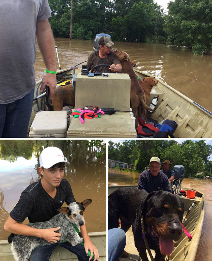 在美国德克萨斯州的布拉佐里亚,一对父子在洪水中救下了30只狗。