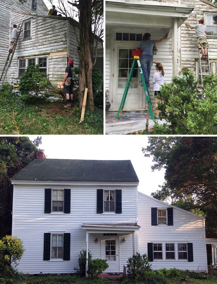 图为邻居们正自发为独居的退休老教师翻修房屋,原本破旧的老房子在邻居的帮助下变得焕然一新。