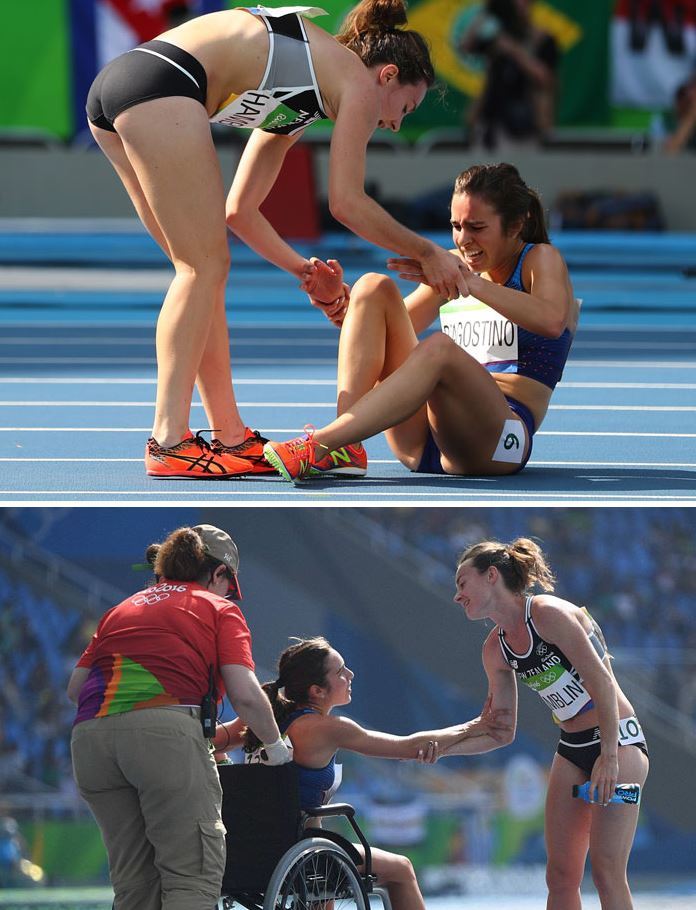 里约奥运会上,一名新西兰运动员和一名美国运动员在5000米径赛中意外跌倒,她们决定停下来帮助对方站起来,并一起走向终点成为了最后一名。