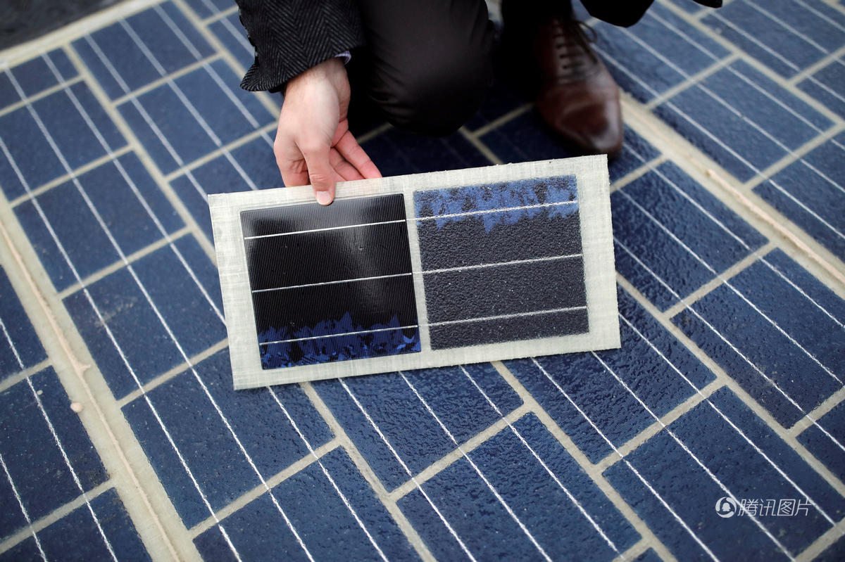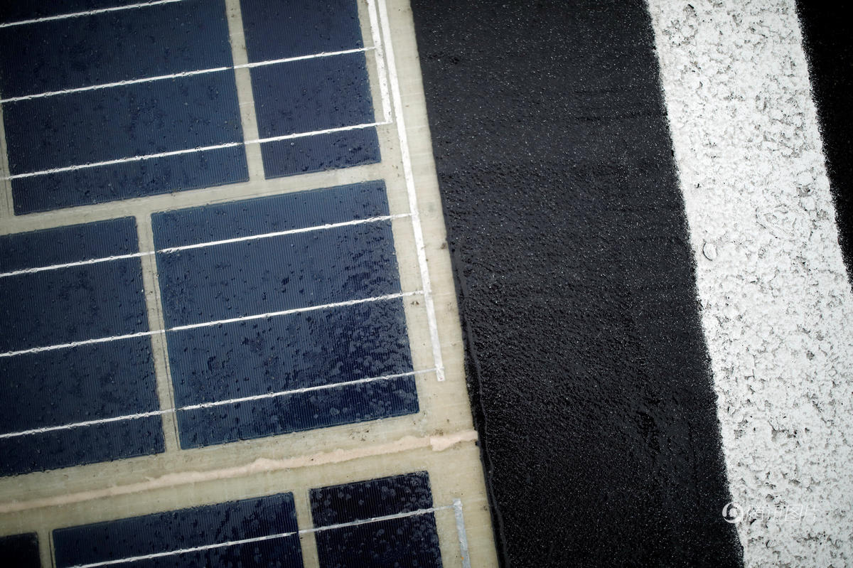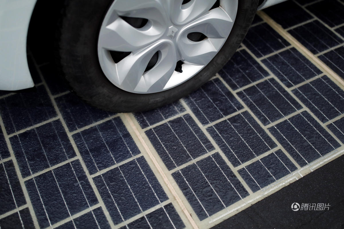 工程人员在涂满泊油的路上,铺了几千米的太阳能面板。其脆弱的光伏板被一种混合聚酯层保护着,可以经得起汽车及各种轻重型车辆经常的往来路压。这种半透明的混合材质可以让阳光透过去,被硅分子吸收进去。