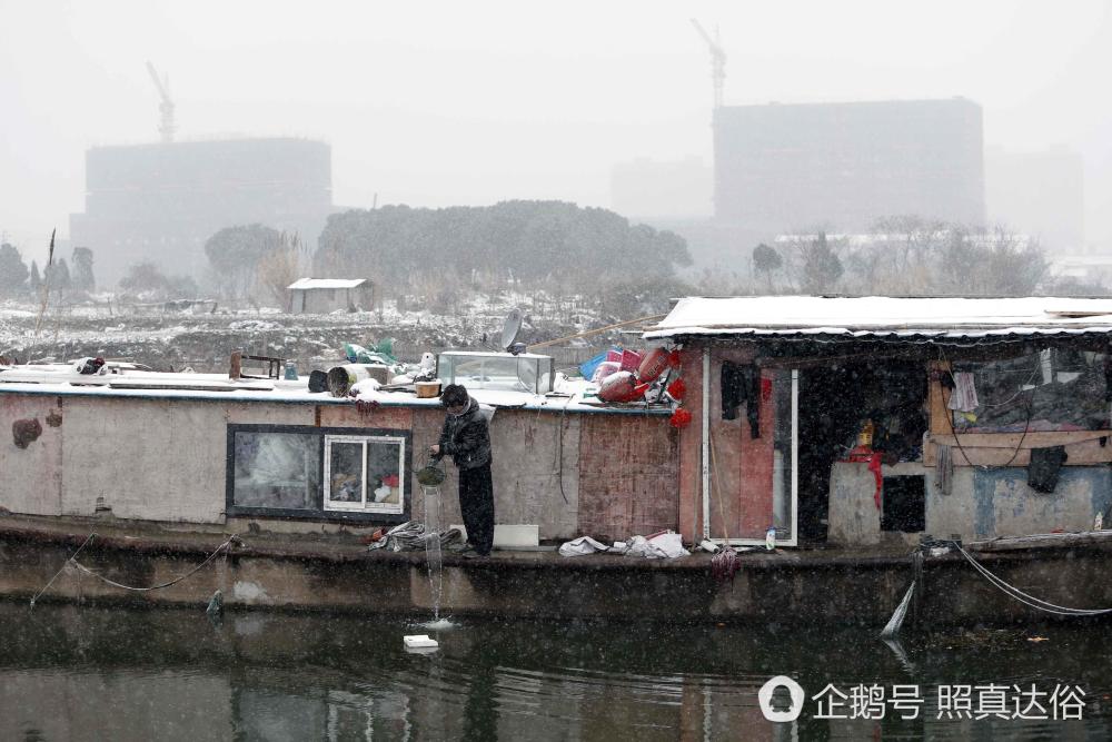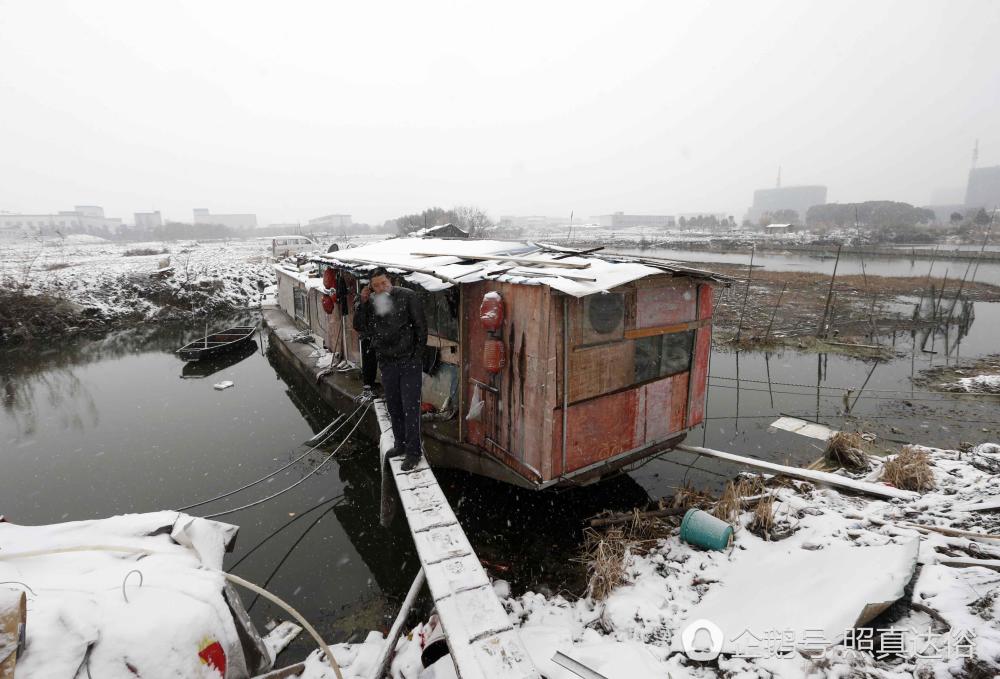 老鲁不老,才50岁,他的二个女儿和儿子都成家,他常说,有时感觉如同做梦。图为2013年2月8日,风雪中,老鲁的儿子鲁小松在水泥船上清倒脏水。