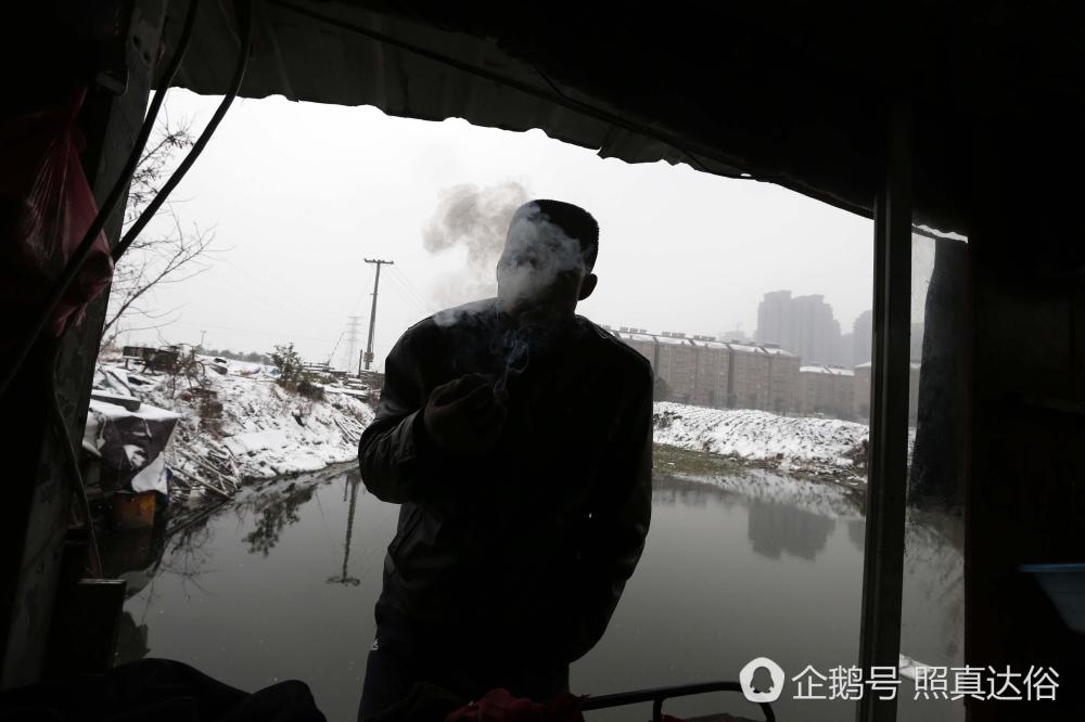 老鲁身高1.76米,身材匀称,看上去精明、健谈、随性、乐观的老鲁烟瘾特别大,用他的话来说,早晨睁开眼,第一件事点根烟,晚上睡前最后一件事,抽根烟。图为2013年2月8日,农历腊月二十八,在嘉兴中环东路南边的河道边,老鲁站在栖身7年的水泥船上,第一次讲述他的故事。