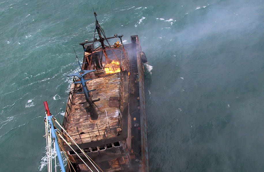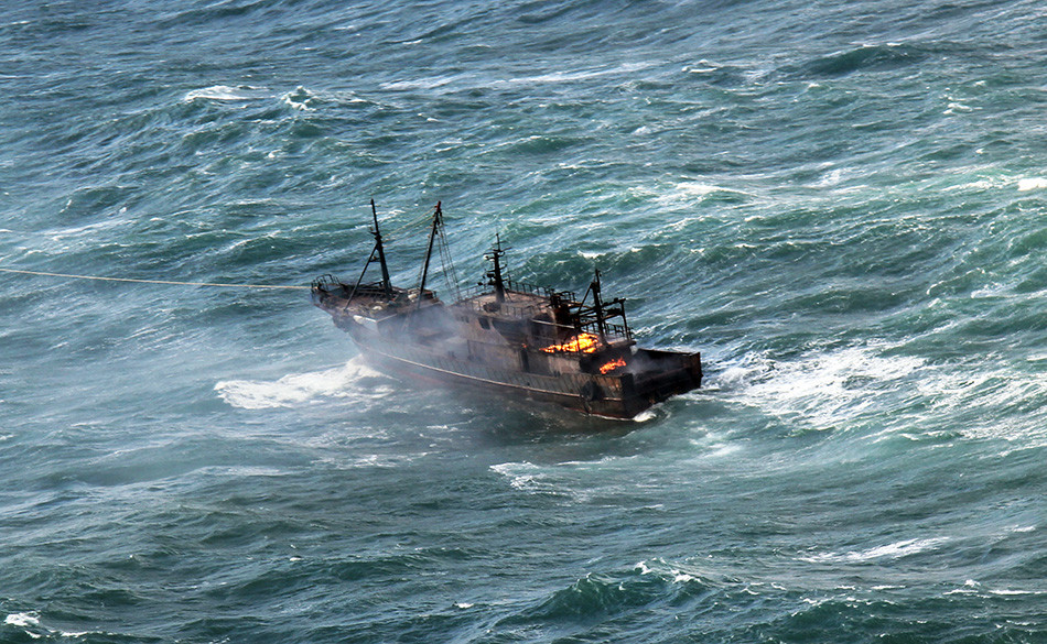 救助实施过程中,海上气象变得更加恶劣,航路上出现了阵雨,风速也变得更大,失火失去动力的遇险船舶像小树叶一样摆来摆去。