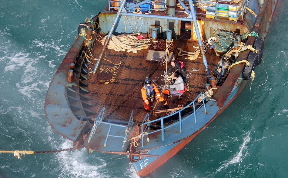 救生员利用救生绳索机降到失火渔船上,协助被困船员登机。