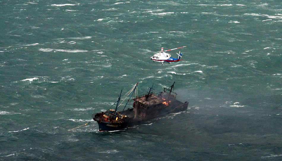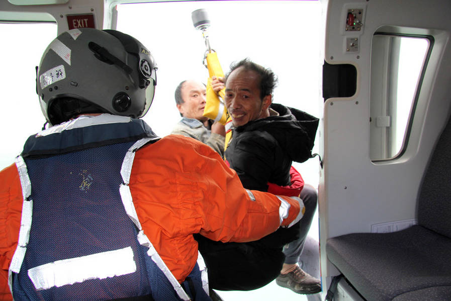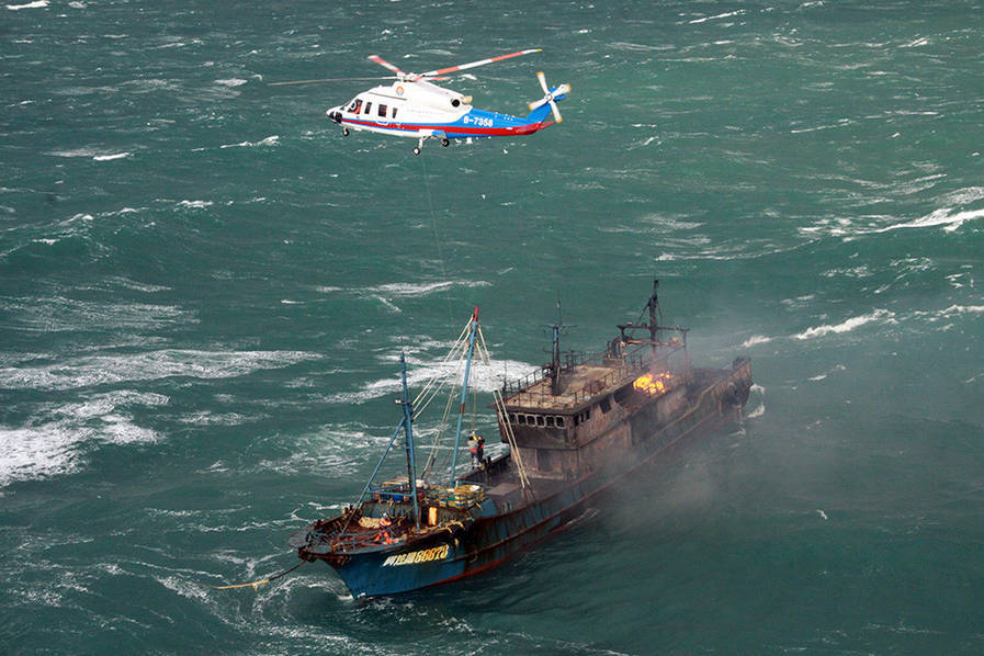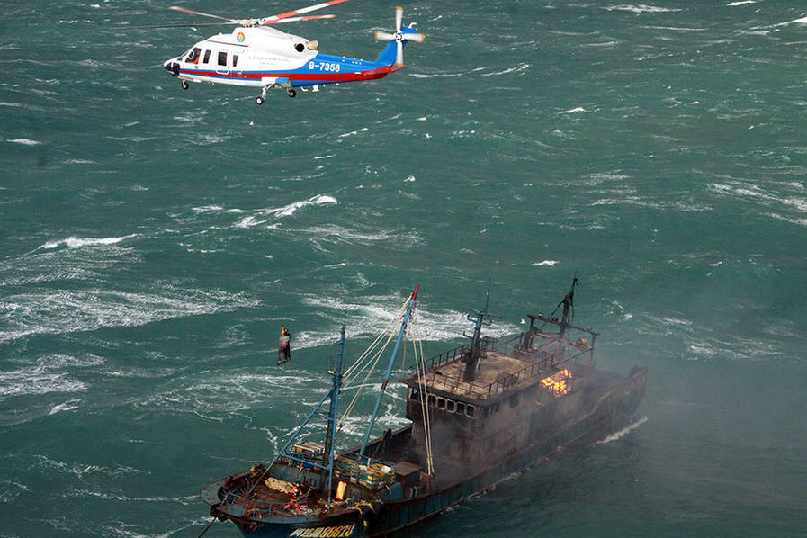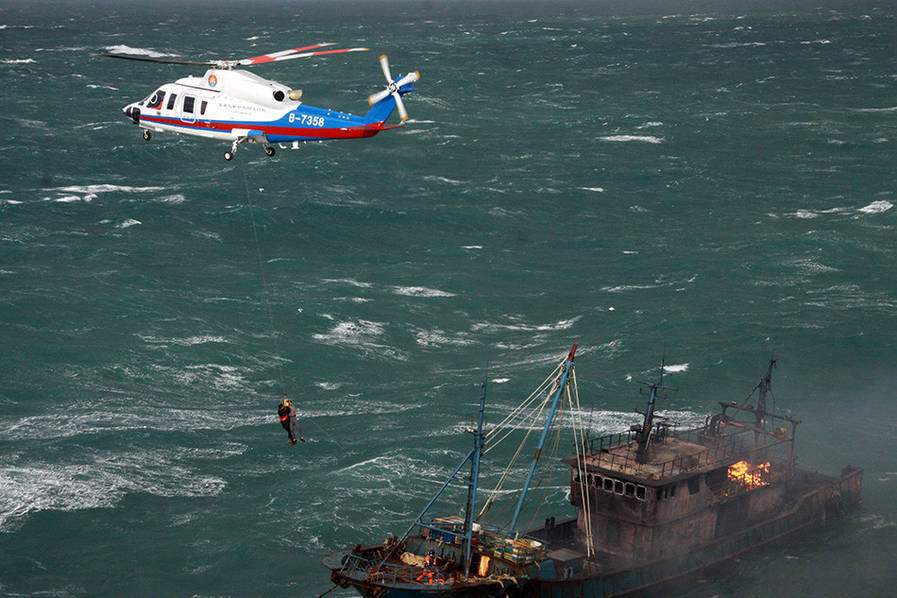 2016年12月27日救助直升机正在失火渔船上空悬停,利用绳索救起被困船员。当日中午13时04分,位于上海外高桥东偏南约90海里的东海海域一艘渔船“闽连渔66678”轮机舱着起大火,现场风速达到35节,浪高6米,其他船只无法接近救援,火助风势越烧越猛,船上的10位船员被困。