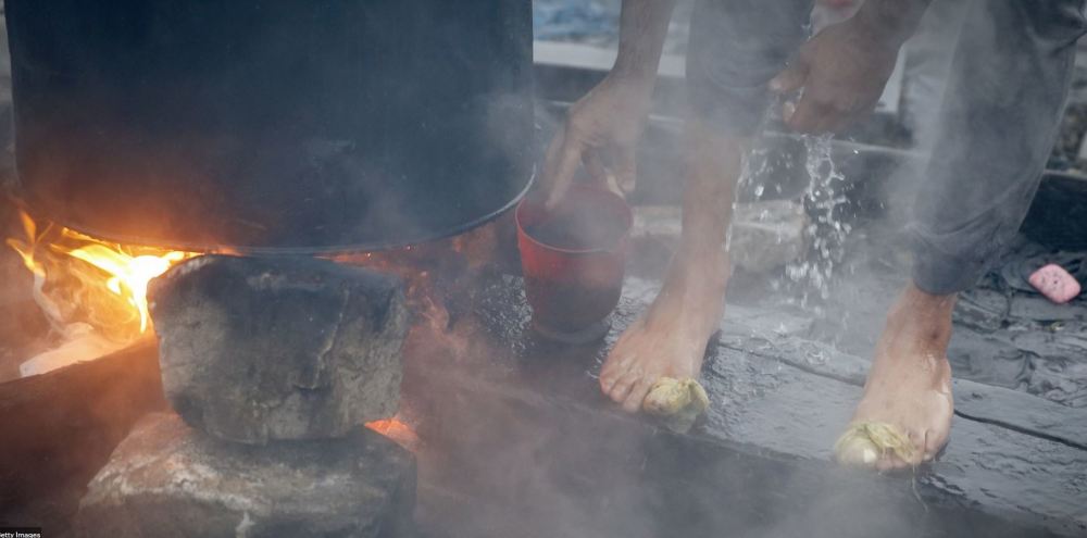 在这样的条件下,他们不得不在室外架起火炉,在破旧的铁桶里加热洗澡水。隐私在这种情况下也不能苛求了。