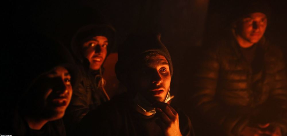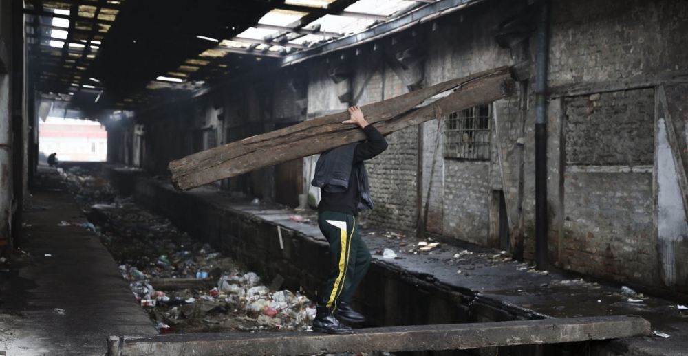 即使是住在仓库里面的人,也需要聚在火堆前取暖,场景就像是灾难片电影画面。