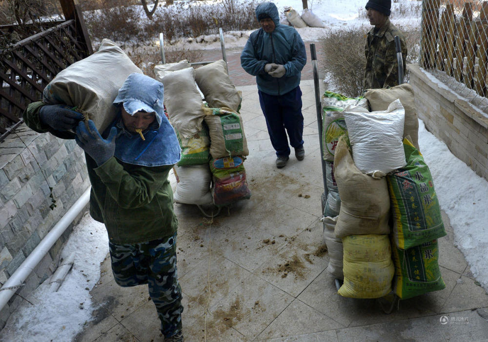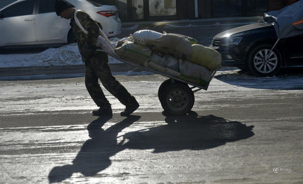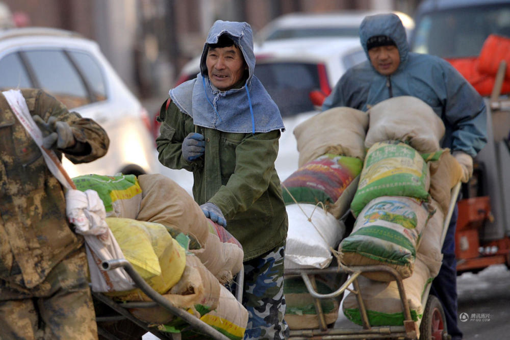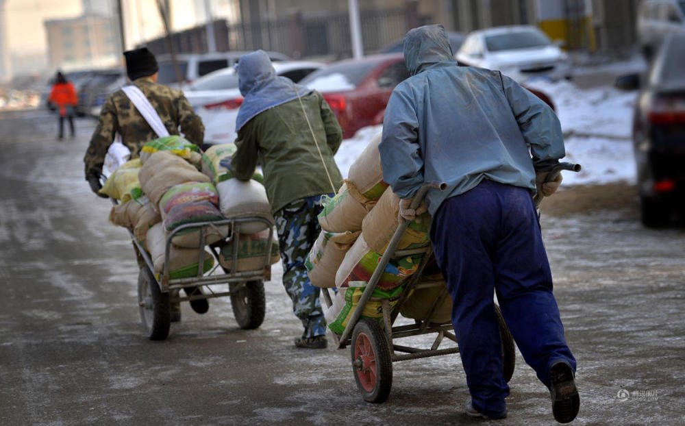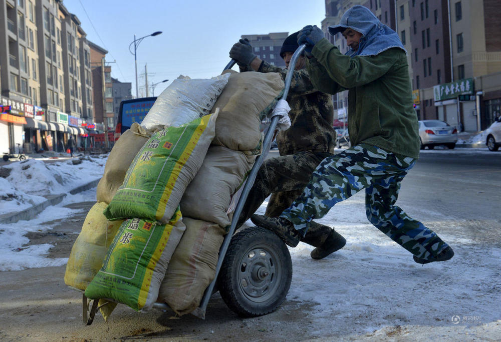 12月27日,辽宁沈阳,当天沈阳迎来寒流天气,气温跌破-20℃。受低温天气影响,户外的行人稀少,许多行驶的车辆尾部排除一串儿白烟。60岁的老陶和他的工友一起在街头搬运沙子,今天他们接到了一单为业户送沙子的生意。