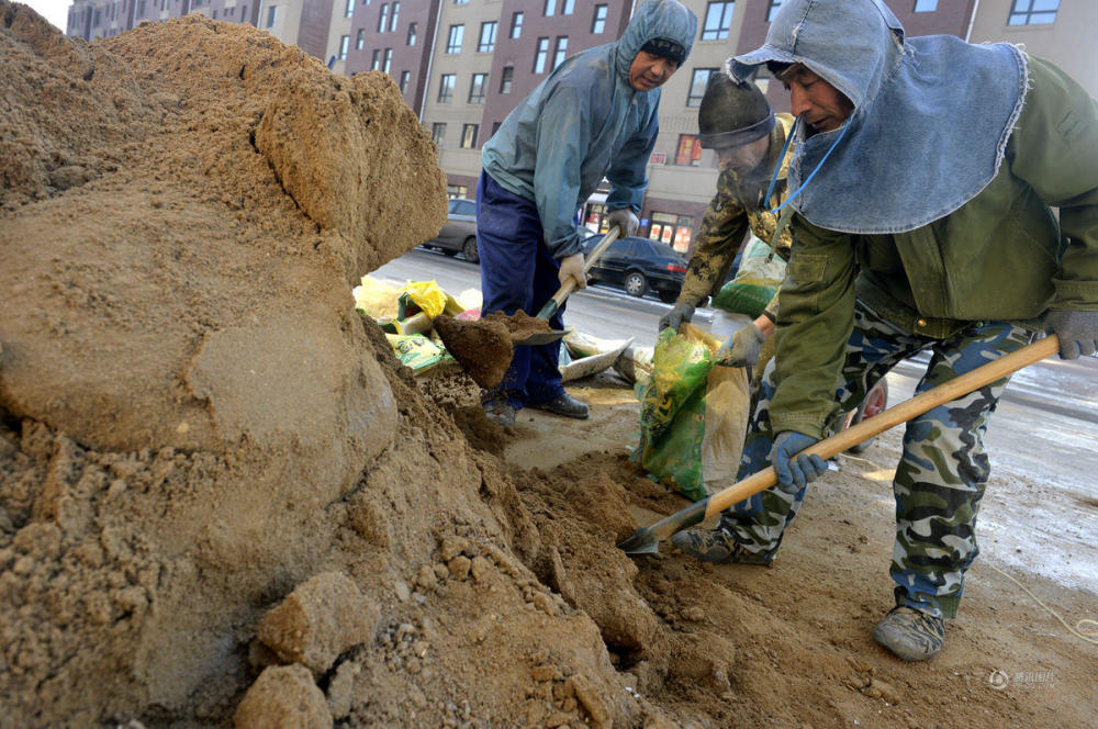 在现场,只见一名力工用手撑起编织袋,老陶和另一位工友用铁锹将沙子铲起装进袋子内,天气寒冷沙子被冻成一坨,铲起来很是费劲。老陶说,一个工人平均一天可以背运超过三立方米的沙子,一立方米大约2400斤,也就是说每个人每天背运沙子达三四吨重。