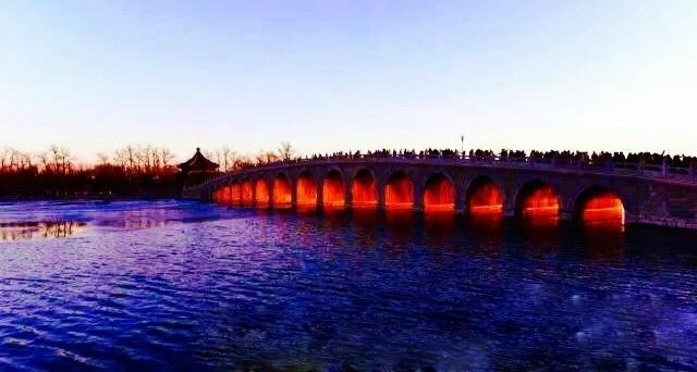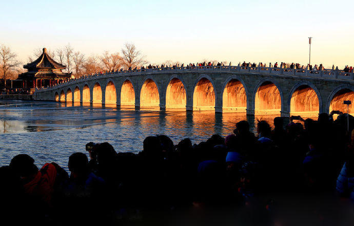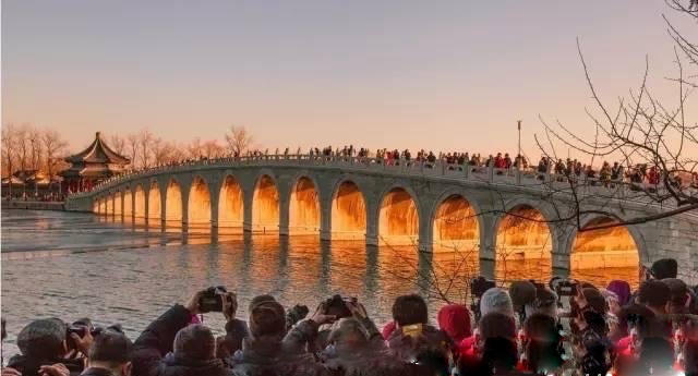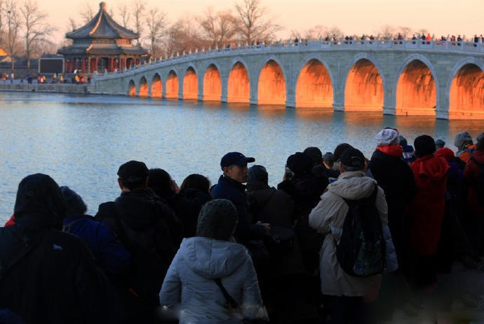 12月27日傍晚时分,北京颐和园十七孔桥附近人山人海,他们有的是来看美景,有的则是专门来拍美景的。当天,颐和园十七孔桥重现“金光穿洞”奇观,落日的余晖将十七孔桥的所有17个孔洞全部照亮,金碧辉煌,让人振奋。