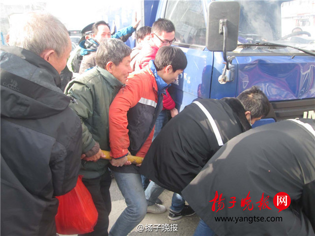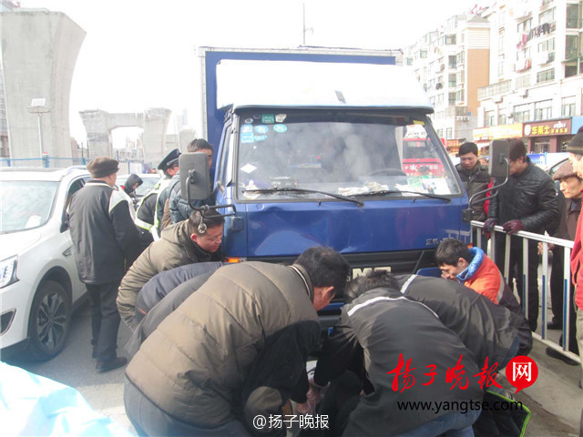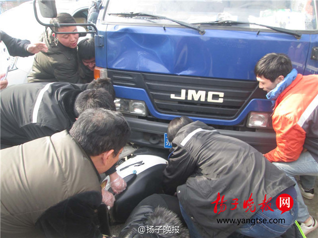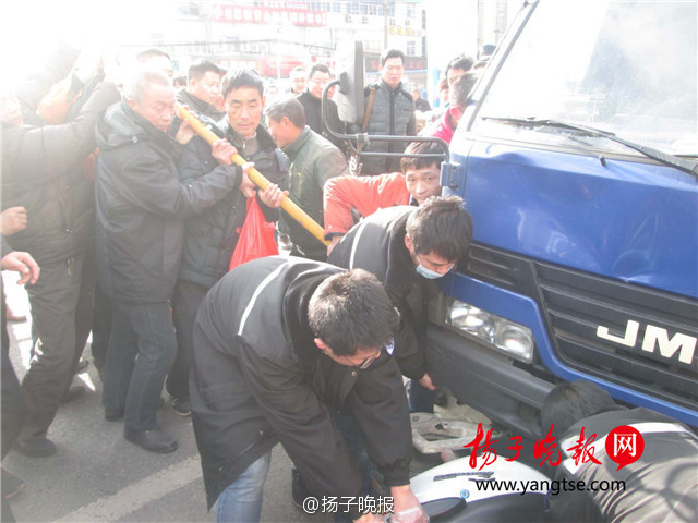 28日下午,镇江市镇江新区丁卯桥路发生一起交通事故,一辆箱式小货车与一辆电动车发生碰撞,电动车和骑手同时被卡在小货车前部无法动弹。事故发生后,在民警的指挥下,许多互不相识的人们,用手抬、肩扛抬车救人。