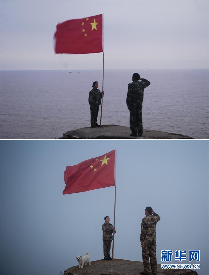 上图,江苏省灌云县开山岛“孤岛夫妻哨”民兵王继才夫妇在海岛的最东边举行升旗仪式(资料照片,2011年沈鹏摄)。下图,2017年1月1日,王继才夫妇在开山岛的最东边举行升旗仪式(新华社记者李响摄)。新华社发
