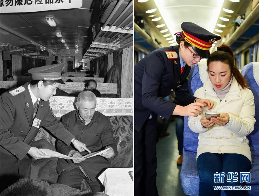 左图,1997年12月31日,在90次呼和浩特至北京列车上,列车长为旅客发意见咨询卡,以改进服务工作(新华社记者李欣摄)。右图,2016年12月31日,K90次列车副列车长王薇(左)帮助旅客连接列车上的WiFi(新华社记者连振摄)。新华社发
