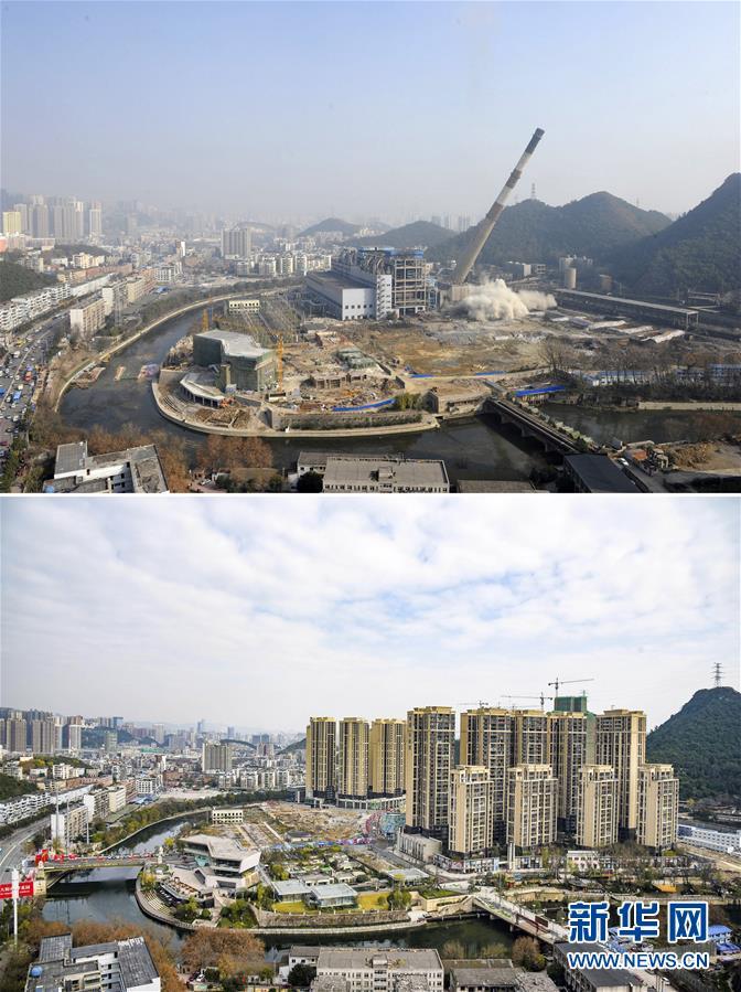 上图,2013年12月31日,贵阳发电厂烟囱伴随爆破声倒地。当日10时50分,随着一声巨响,240米高的烟囱被成功爆破拆除。为响应国家节能减排号召,贵阳发电厂于2012年5月关停(新华社记者欧东衢摄)。下图,2017年1月1日,原贵阳发电厂烟囱所在地已经变为住宅小区(新华社记者刘续摄)。 新华社发