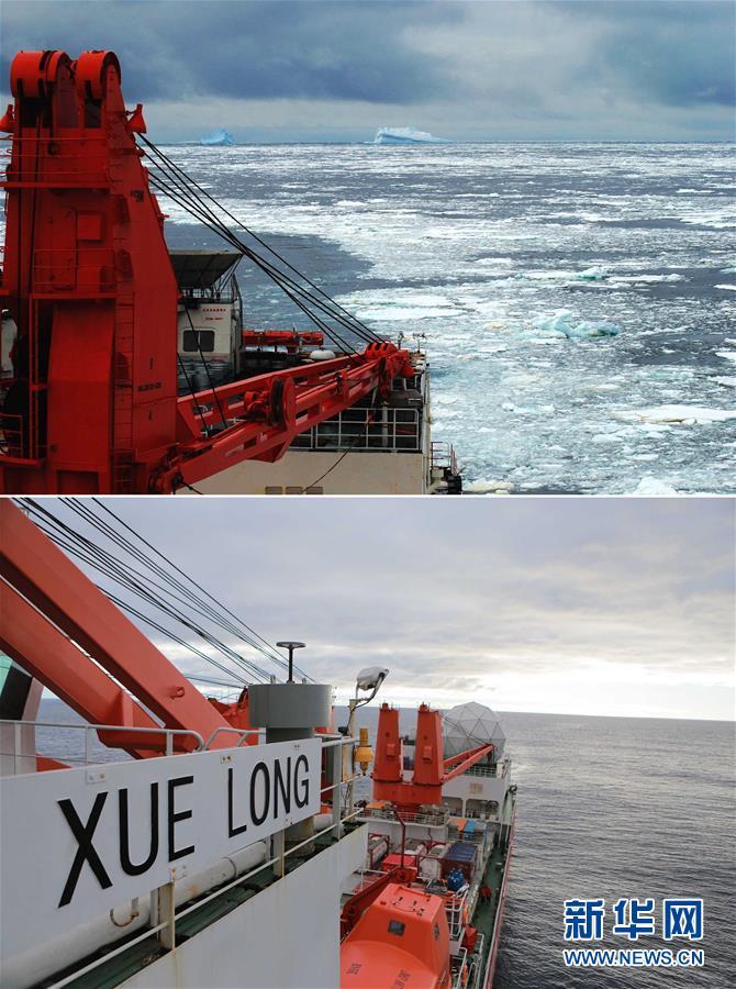 上图,当地时间2007年12月30日16时55分(北京时间2007年12月31日0时55分),“雪龙”号越过零度经线,正式进入西半球(新华社记者张建松摄)。下图,当地时间2016年12月31日(北京时间2017年1月1日),“雪龙”号行驶在南大洋上(新华社记者荣启涵摄)。 新华社发