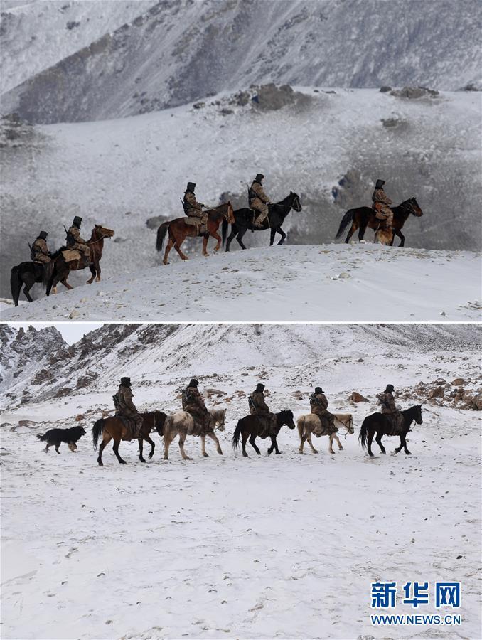 上图,2011年1月1日,驻守帕米尔高原海拔4700多米的红其拉甫边防连巡逻小分队,冒着零下28摄氏度的严寒骑马执勤(向文军摄)。下图,2017年1月1日,红其拉甫边防连巡逻小分队骑马执勤(杨映伟摄)。新华社发