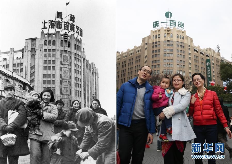 左图,1955年新年的上海街头景象(资料照片)。右图,2017年1月1日,上海市民陈文燕(右二)与家人在上海人民广场合影(新华社记者丁汀摄)。新华社发