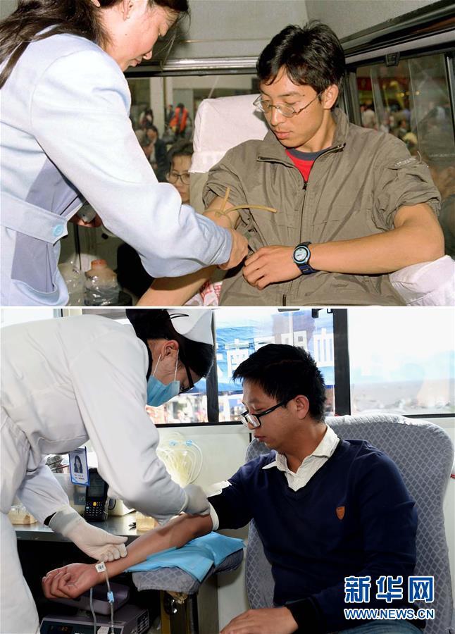 上图,2002年元旦期间,云南师范大学学生辛锡灿(右)在昆明东风广场义务献血。下图,2017年1月1日,云南大学的毕业生罗涛(右)在昆明市南屏步行街义务献血。 新华社记者蔺以光摄
