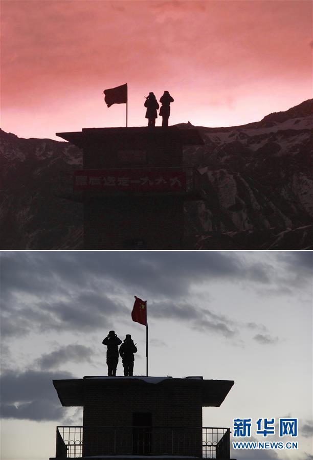 上图,1999年12月31日20点36分,斯姆哈纳边防连战士在“西陲第一哨”送走1999年最后一缕夕阳,守卫着祖国的西大门(赵建伟摄)。下图,2016年12月31日,斯姆哈纳边防连排长孙峰(左)与战士常刚在“西陲第一哨”执勤,守卫着祖国的西大门(崔紫阳摄)。新华社发