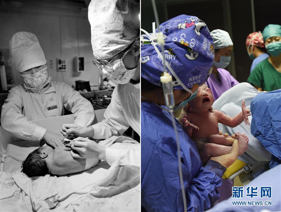 左图,1992年元旦,北京市东四保健院的医护人员为该院1992年接生的第一名婴儿进行乙型肝炎疫苗免疫接种(新华社记者王呈选摄)。右图,2017年1月1日0时20分许,北京妇产医院迎来该院2017年接生的第一个小宝宝,医护人员把刚出生的婴儿给妈妈李女士看。李女士说给女儿起的小名叫如意(新华社记者李文摄)。新华社发