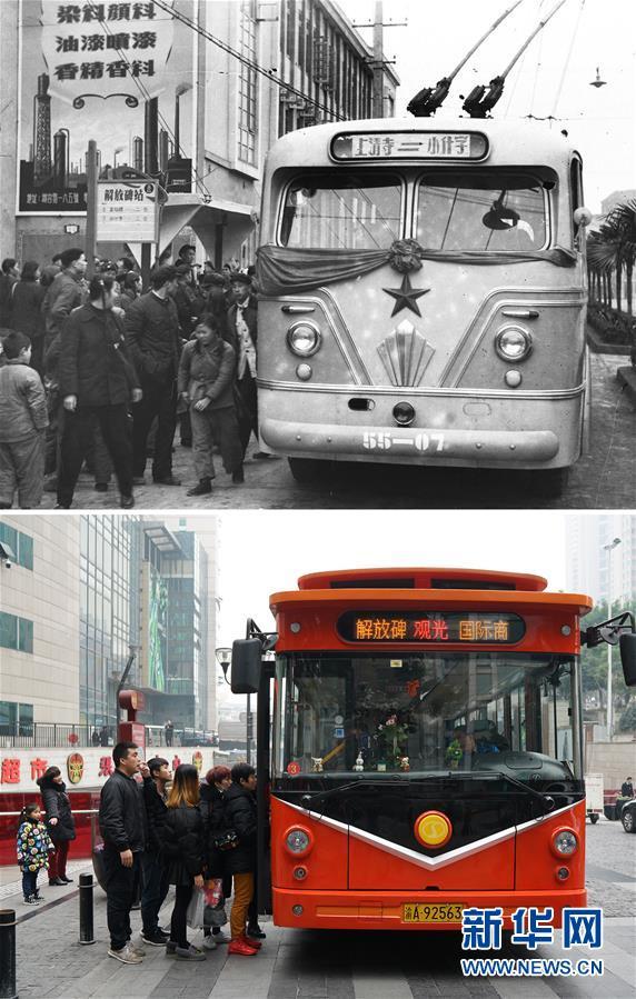 上图,1956年元旦,重庆开始通行无轨电车。这是一辆电车停靠在解放碑站(新华社记者刘诗临摄)。下图,2017年1月1日,一辆重庆旅游观光车停靠在解放碑站,这条观光线路刚运行不到4个月(新华社记者陈诚摄)。 新华社发