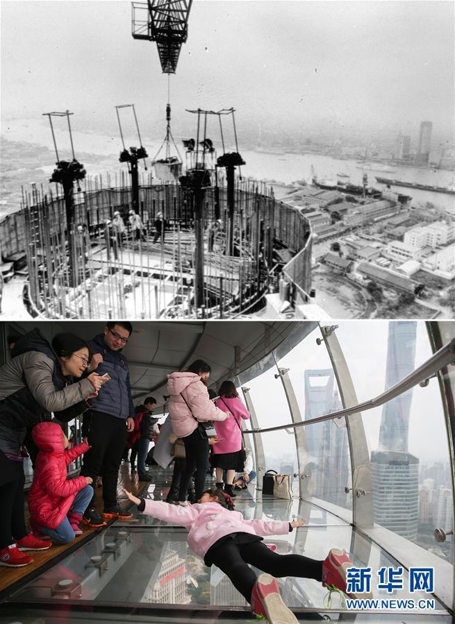 上图,1993年元旦,建设者在上海东方明珠电视塔工地高空施工(张郇摄)。下图,2017年1月1日,游客在上海东方明珠电视塔游览观光(新华社记者裴鑫摄)。新华社发