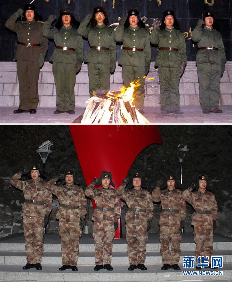 上图,2000年1月1日0时,驻守在黑龙江省抚远乌苏镇“东方第一哨”的官兵们在零下39摄氏度的严寒中宣誓守好祖国东大门(资料照片)。下图,2017年1月1日0时,“东方第一哨”的官兵们宣誓守好祖国东大门(汤俊勇摄)。 新华社发