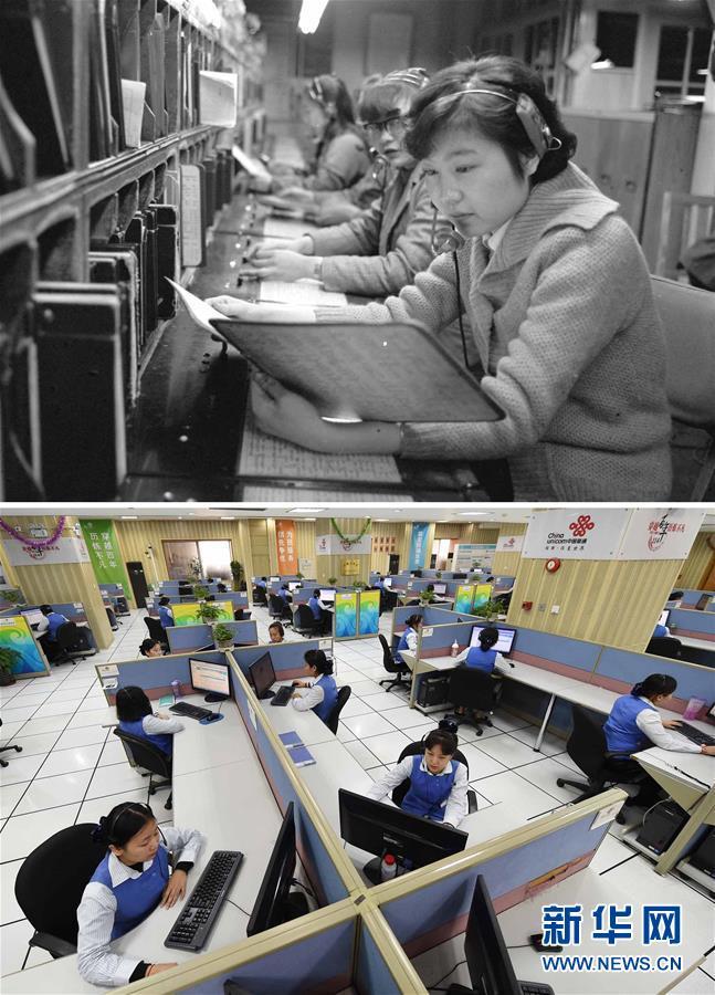 上图,1986年元旦,北京114查号台的工作人员伴随着新年钟声,开始了新一年的查号服务工作(新华社记者张树源摄)。下图,2017年1月1日,北京联通114平台的工作人员正在工作(新华社记者李文摄 )。 新华社发