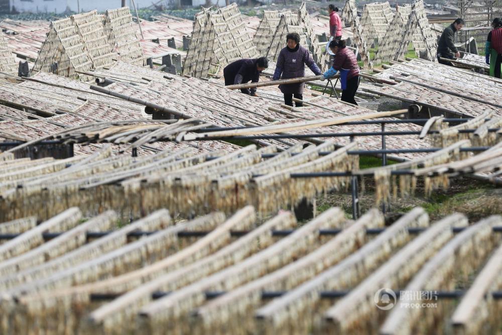 2017年1月9日,在浙江省温州市蒲岐镇下侯宅村,村民忙着晾晒各种鱼干、鱼鲞供应春节市场,千吨级鱼干晾晒,场面壮观。李兵/视觉中国